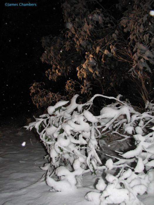 Snow draped over shrubs and trees. The weight of the snow became too great, and trees branches (and soon whole trees) started falling.